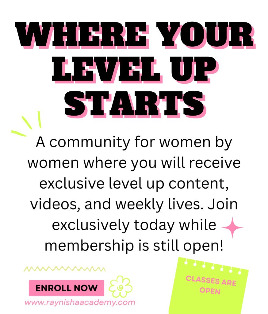 SPOTS ARE LIMITED! Join Raynisha Academy today while enrollment is still open. The next live class is soon. Your level up, progression, and solidified self-love is waiting for you eagerly. Don’t miss the next amazing class!